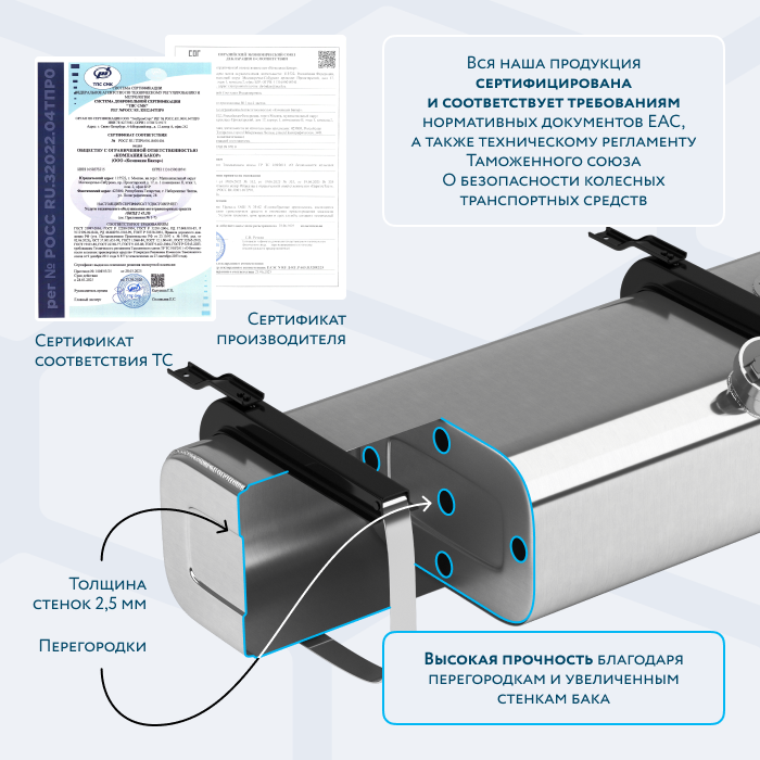 Топливный бак нашего производства изготовлен из сортового алюминия увеличенной толщины 2.5 мм. Для дополнительного усиления прочности бак оснащен ребрами жесткости в виде трех внутренних перегородок, приваренных по периметру, основная функция которых — это обеспечение плавного перетекания топлива и нейтрализации гидроударов.